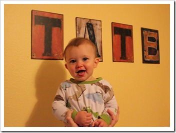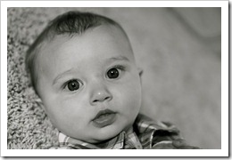 He got much more stable while sitting (so long as a big whirlwind brother didn’t bump into him). He started scooching around the floor at the beginning of the month, but it was mostly a combination of reaching and rolling, not really crawling.